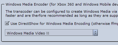 Make sure the “Use DirectShow…” checkbox is checked and that the Windows Media Video version is set to “11?. You can choose an older version of Windows Media for faster decoding but 11 produces the best image quality (at least on paper).