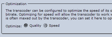 The goal here is to optimize the transcoder to output the best possible video quality possible. Keep in mind that this involves a great deal of horsepower and network bandwidth. I am transcoding on a 1.5Ghz AMD processor over a 10/100 wired network (with an excellent connection) and have yet to hit my head on the ceiling with these settings. Your mileage may vary and if it does you will need to scale back where appropriate, especially if dealing with HD content.